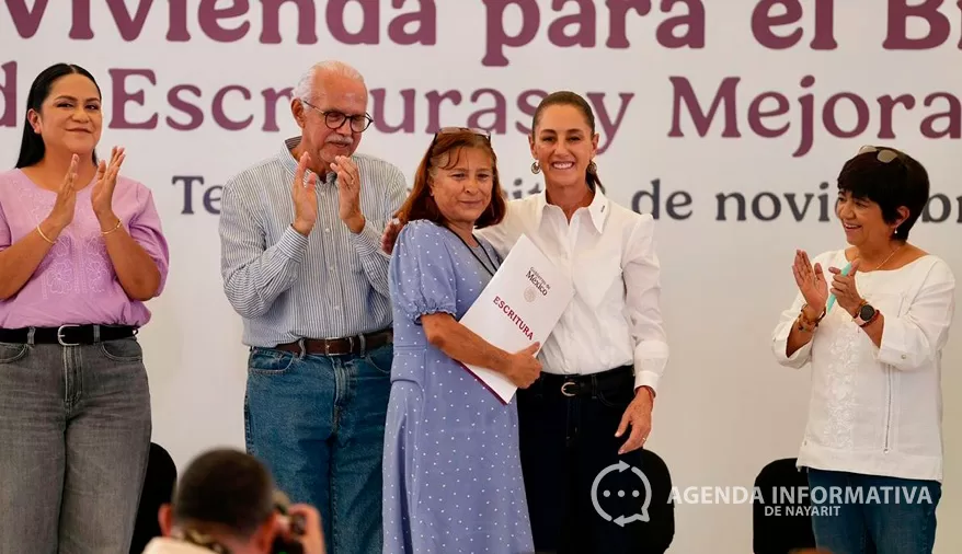 La presidenta de México, Claudia Sheinbaum Pardo, encabezó este sábado en el Parque La Loma de Tepic el evento “Vivienda para el Bienestar. Entrega de Escrituras y Mejoramiento de Vivienda”, donde junto al gobernador Miguel Ángel Navarro Quintero entregó más de 400 escrituras a familias nayaritas y dio inicio formal al programa en la entidad.