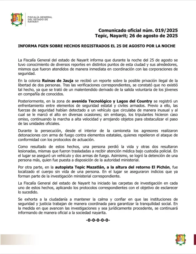 La Fiscalía General del Estado de Nayarit confirmó que distintos reportes de seguridad registrados en Tepic la noche del 25 de agosto derivaron en un enfrentamiento armado con saldo mortal.