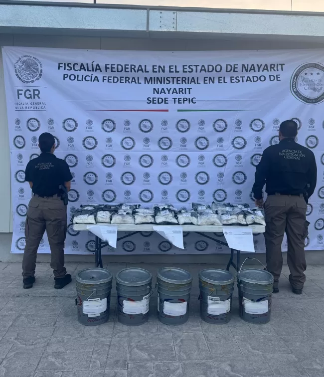 En acciones operativas, agentes aseguraron cinco cubetas con paquetes de metanfetamina que sumaron un peso de 22 kilos con 500 miligramos.