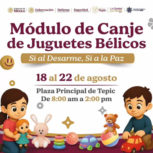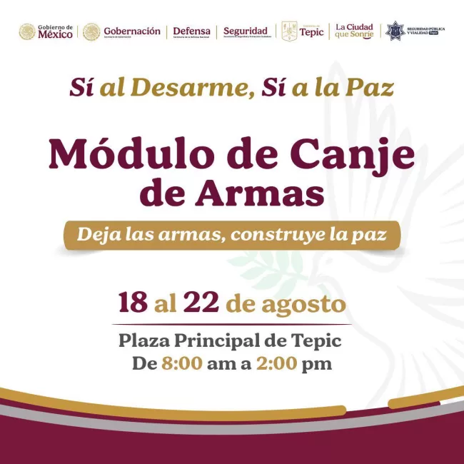 Del 18 al 22 de agosto se realizará en la Plaza Principal de Tepic la jornada “Sí al Desarme, Sí a la Paz”. 🕊️