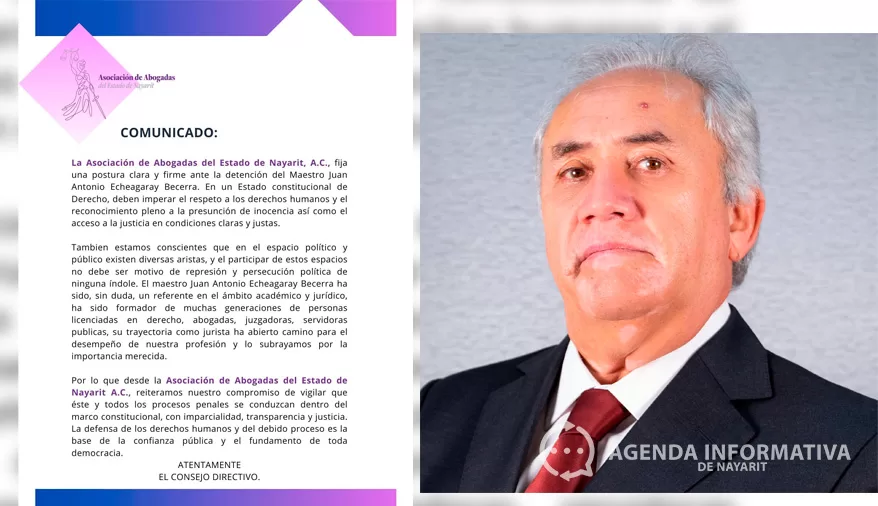 La Asociación de Abogados del Estado de Nayarit fijó una postura pública tras la detención del notario Juan Antonio Echeagaray Becerra, y exigió que el proceso se conduzca con respeto a los derechos humanos, la presunción de inocencia y el debido proceso.